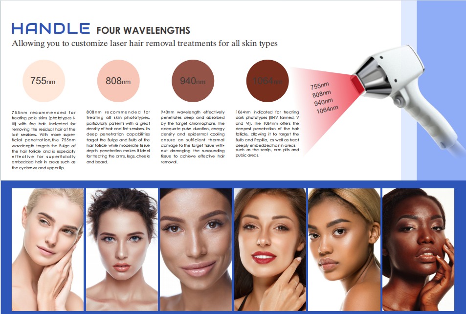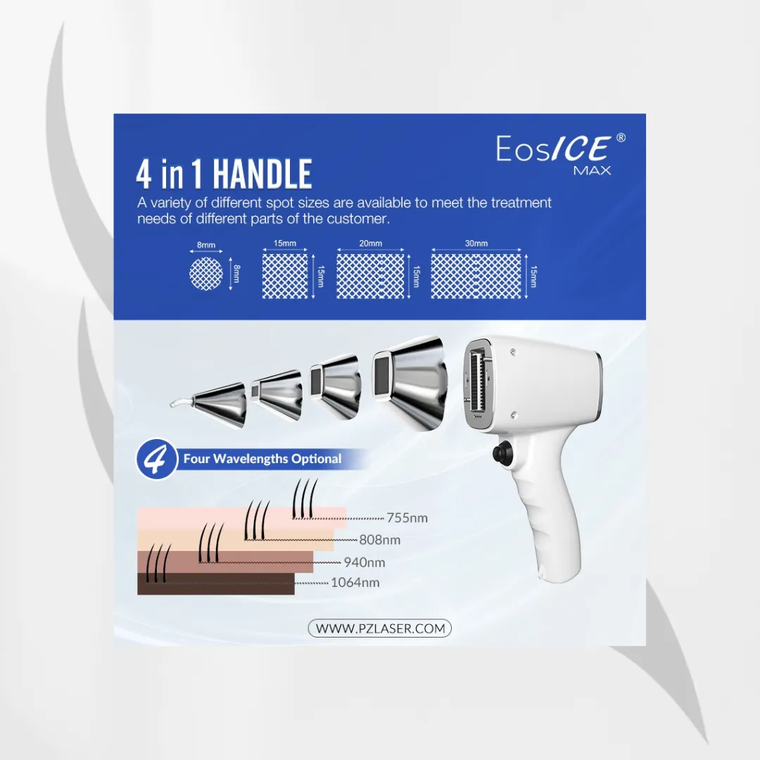 4 hullámhossz egy rendszerben (755 / 808 / 940 / 1064 nm) – szélesebb bőr- és szőrtípus lefedés.